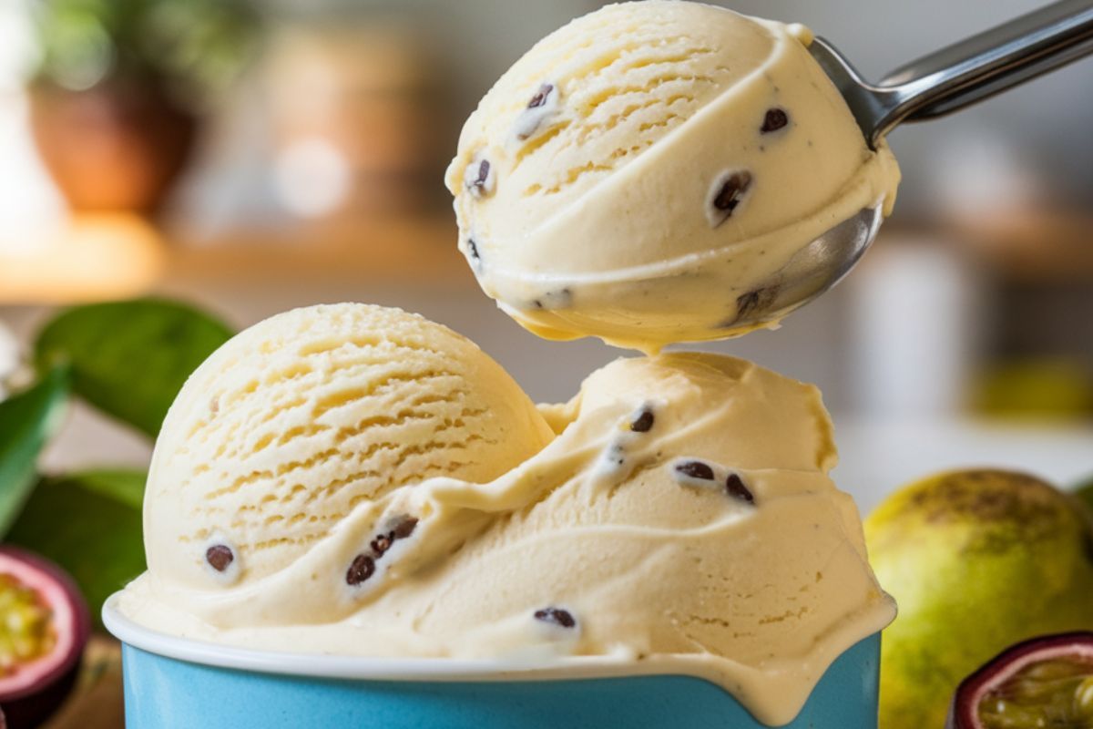 - Esse sorvete combina perfeitamente com uma calda extra de maracujá ou raspas de chocolate branco na hora de servir.